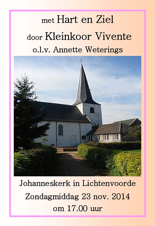 Kleinkoor Vivente gaf haar eerste “met Hart en Ziel” matinee op zondag 23 november 2014. Gedurende drie kwartier zongen wij een door Annette Weterings samengesteld programma bestaande uit tien liederen uit ons repertoire, onderbroken door een verhaal en gedicht van Ank van ter Toolen. De pianobegeleiding was in handen van Tonnie Heutinck.